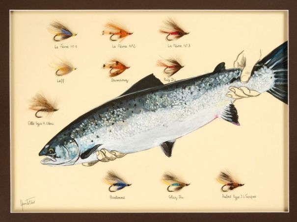 Mais les paysans bretons qui guident les pêcheurs anglais sur les meilleurs secteurs de leurs rivières ne perdent pas leur temps. En récupérant quelques mouches « égarées » dans les arbres par les pêcheurs anglais, ils vont s’attacher habilement à les copier avec les moyens du bord. Les plumes exotiques et rares en provenance des colonies britanniques seront remplacées par des plumes de paonne ou de poule, de la bourre de sanglier, du poil de blaireau ou de lièvre. Ces nouvelles mouches anglaises arrangées « à la bretonne » vont être peu à peu améliorées en fonction de la couleur de l’eau et du profil de chaque rivière. Les pêcheurs bretons ayant peu d’occasions de se retrouver d’une rivière à l’autre, une très grande diversité de modèles va ainsi voir le jour. Ces mouches bretonnes seront bien souvent baptisées du nom de la rivière où elles avaient vu le jour : la noire de l’Odet, la mouche du Léguer… . Elles portaient aussi le nom de leur monteur : la mouche du père Le Gall, la mouche du Père Clerc, la mouche du Commandant Latour…