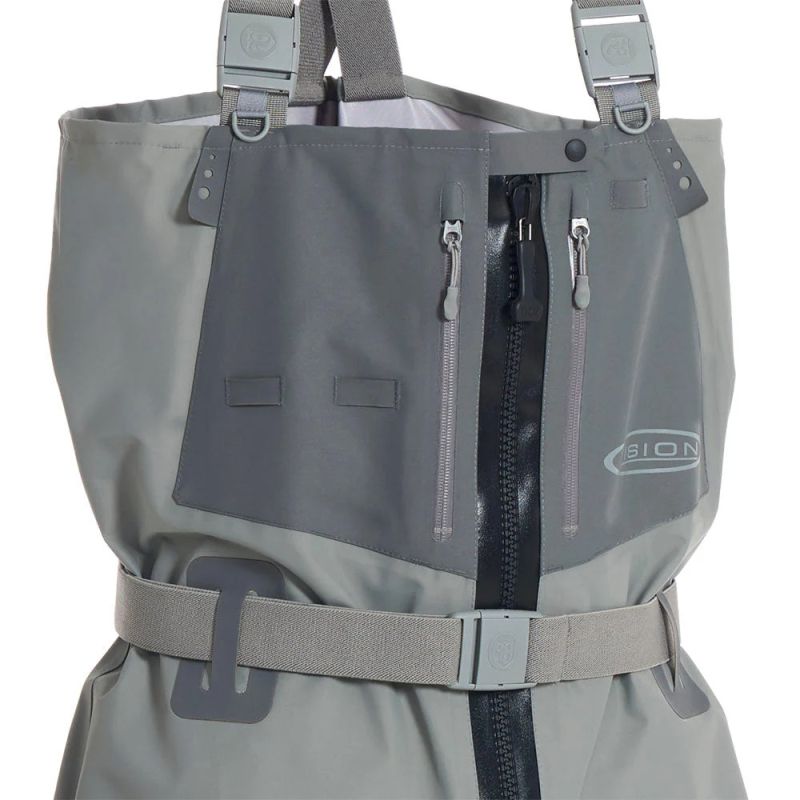 Le waders KOSKI ZIP Vision est doté de deux poches avant zippées et étanches, avec attache porte-accessoires et sangles supplémentaires à l’extérieur et à l’intérieur de la poche. La fermeture à glissière principale TiZip Masterseal 10 et les autres à glissière YKK AquaGuards sont toutes de haute qualité. Le KOSKI ZIP est équipé de chaussons en néoprène, pied droit – pied gauche.